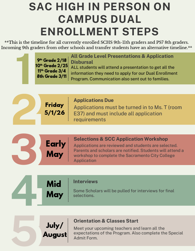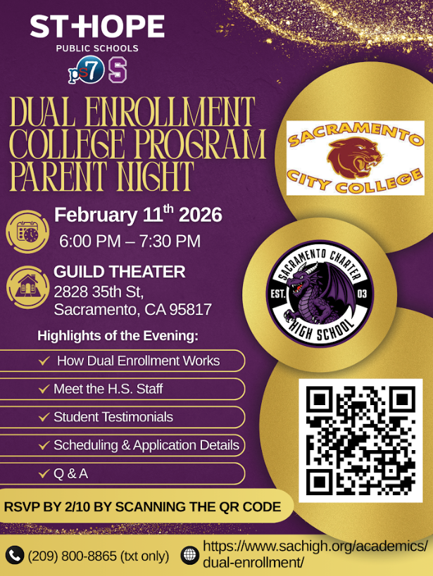 We are thrilled to continue to offer our In Person Dual Enrollment Program, in collaboration with Sacramento City College. We are proud to offer this exciting program as we continue to expose our St. HOPE scholars to new opportunities and show them the power of getting a college education. Through this program, Sac High scholars (9th-12th grade) can apply to take college courses at the Sac High campus during their normally scheduled day, for both high school credit AND college credit, FOR FREE! All courses are UC and CSU Transferable courses. Classes will be taught in-person by college professors two days a week and the other three days, scholars will complete their online college work with a St. HOPE co-teacher in class. Applications open in the Spring time for the following year. If you are interested in applying, all scholars attend grade level presentations about Dual Enrollment in March. All scholars are given applications that are due to Ms. Davis or Ms. T by the end of April. See the SCHS DE Steps flyer for more information –