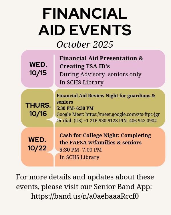 We know that Financial Aid can be an obstacle for scholars when it comes to post secondary education. We are here to help! We host a few Financial Aid events throughout the year and help every senior and their family complete the Financial Application for Federal Student Aid (FAFSA). Please see the Financial Aid Events and other helpful attachments below.